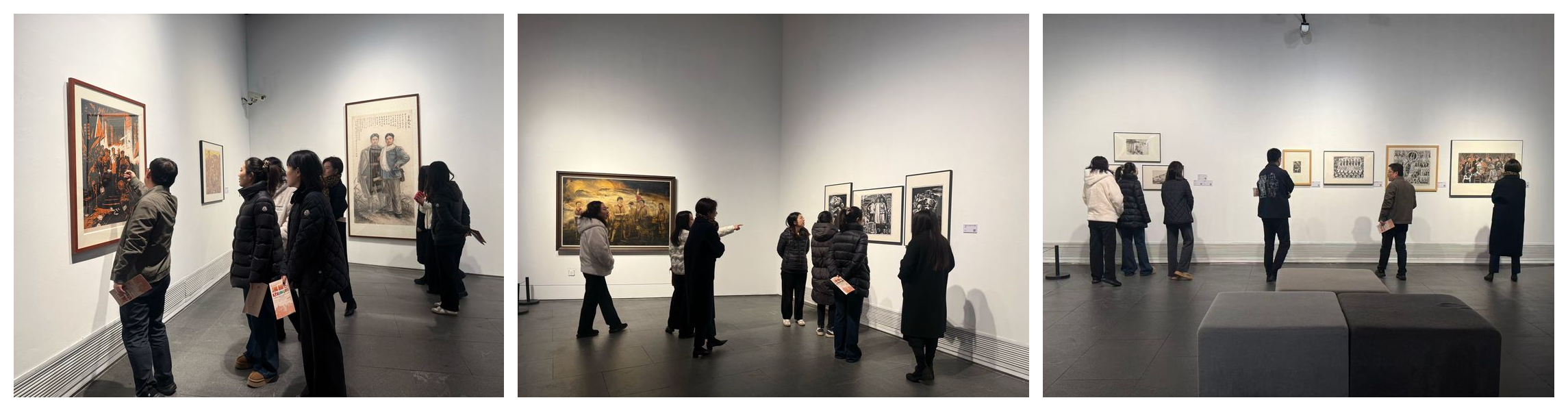 步入展厅,一幅幅气势恢宏的美术作品映入眼帘,生动展现了江西革命与建设时期的壮丽画卷。从革命年代的烽火硝烟到建设时期的艰苦奋斗,艺术家们或用画笔,或用制版印刷技术定格了无数感人至深的瞬间,让参观者仿佛置身于那段波澜壮阔的历史长河之中。艺术的鲜活载体,生动的视觉呈现,带领着全体人员重温党的光辉历程,感受革命岁月的激情与力量。大家有的驻足于作品前认真欣赏作品观看注释,有的围绕作品内容开展热烈讨论。无论是描绘革命先驱英勇斗争的场景,还是展现建设者们热火朝天劳动的画面,都深深触动了每一位参观者的心灵。艺术作品不仅更加直观地让大家了解了江西革命与建设的历史,更使参观者们深刻感受到了革命先辈们不畏艰难、勇于奉献的精神品质。